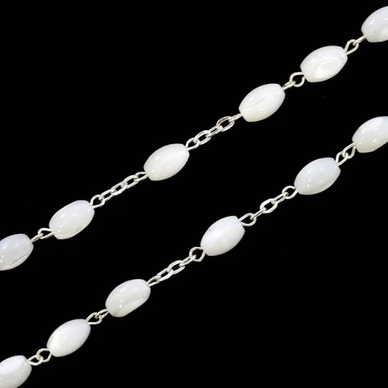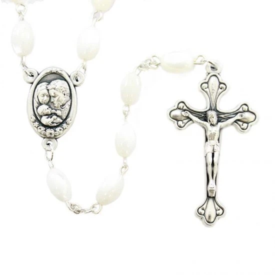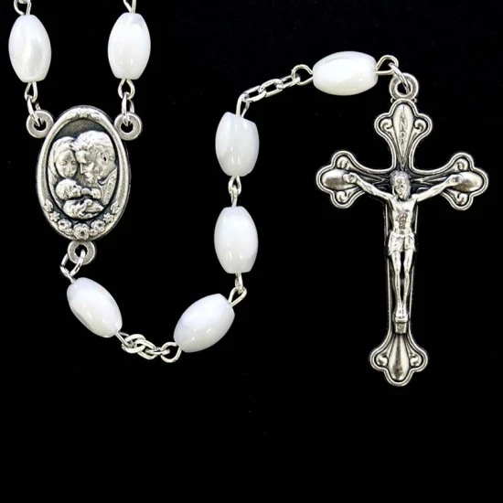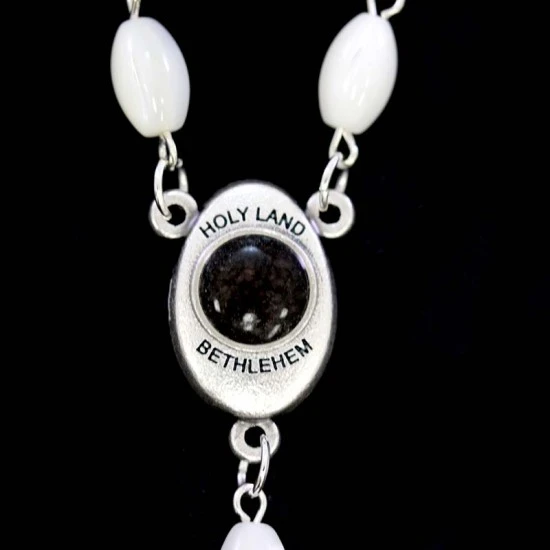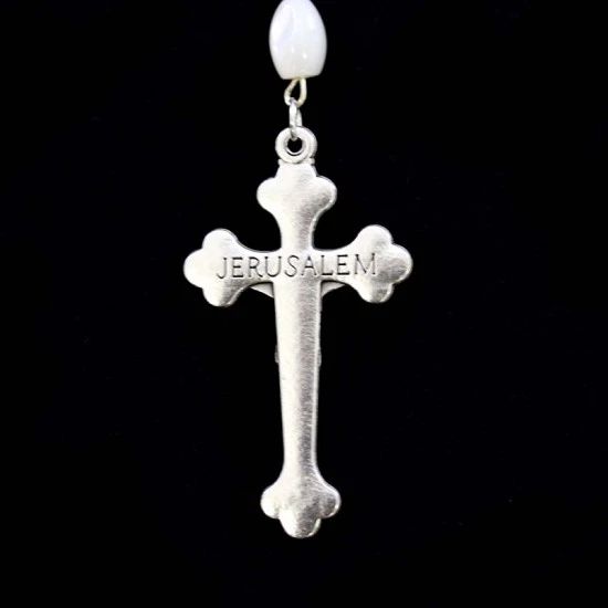 Corona da rosario con grani ovali in vera madreperla. La legatura, il crocifisso e la crociera sono in metallo argentato. Internamente alla crociera è contenuta la Terra Santa. Made in Jerusalemme