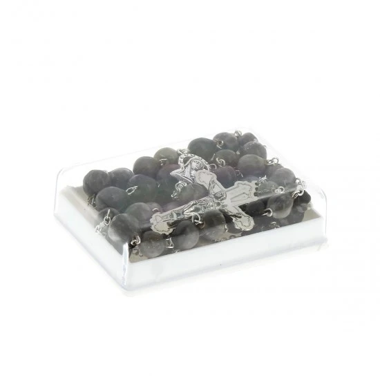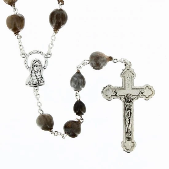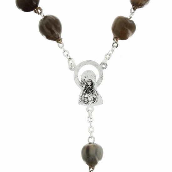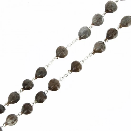 Rosario lacrime di Giobbe realizzato con grani in legno legati in metallo argentato. La crociera e il crocifisso pendente sono in metallo.