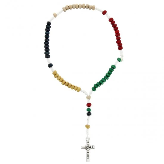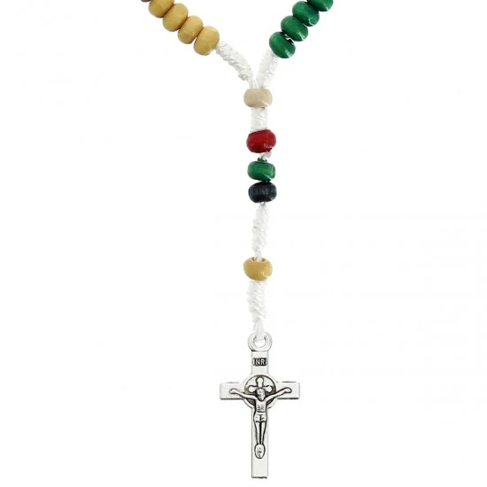 Mini Rosario Missionaro con grani in legno a forma di rondella legati con filo bianco e croce pendente in metallo. Fornito in bustina di plastica trasparente.