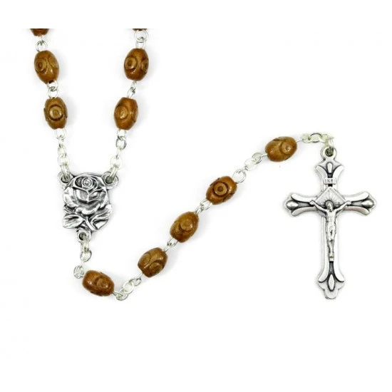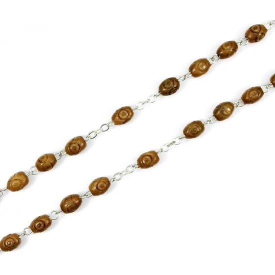 Rosario con grani ovali in legno inciso, la legatura, il crocifisso e la crociera sono in metallo argentato.