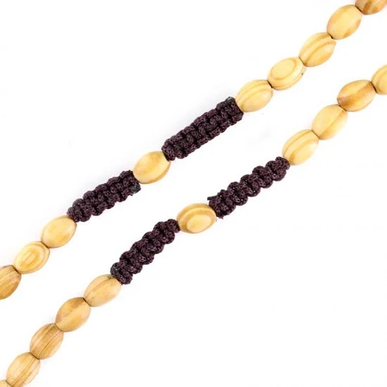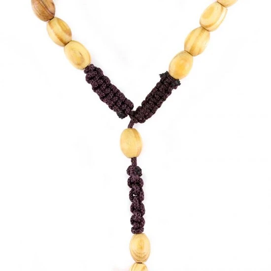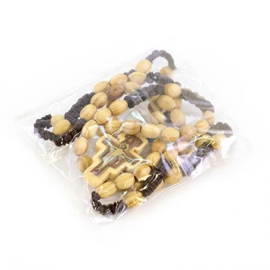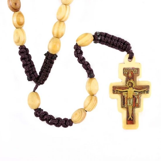 Rosario con Crocifisso di San Damiano realizzato con grani ovali in legno legati con seta marrone.