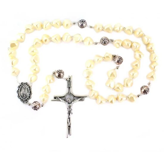Rosario Madonna di Fatima realizzato con grani imitazione perla, legatura, pater e Crocifisso pendente in metallo argentato. La crociera è realizzata in metallo e raffigura la Madonna di Fatima.