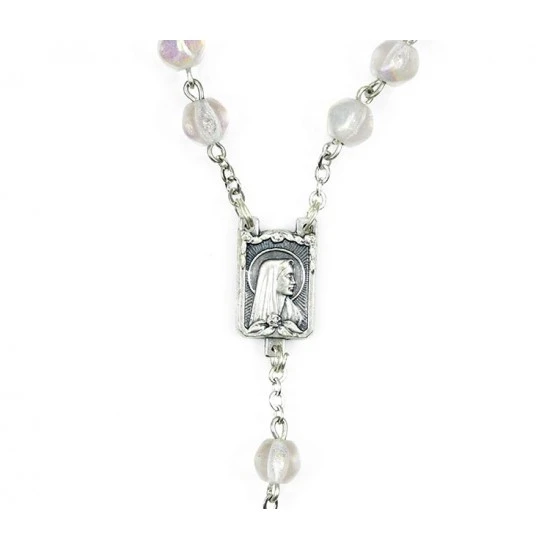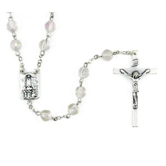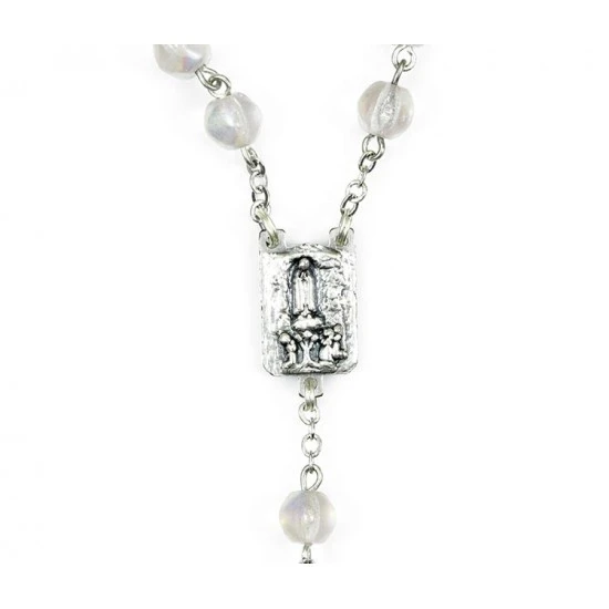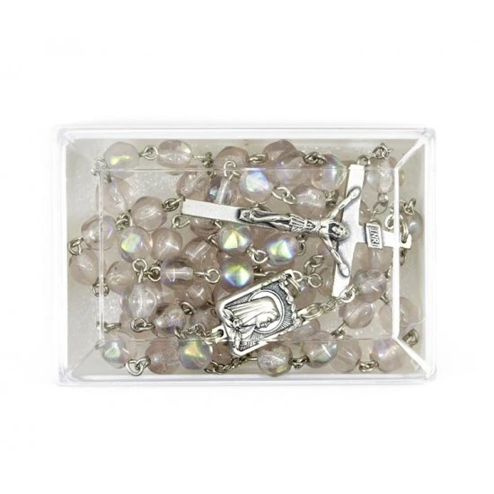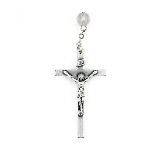 Rosario realizzato con grani in vetro sfaccettato. La legatura, il crocifisso e la crociera sono in metallo argentato.