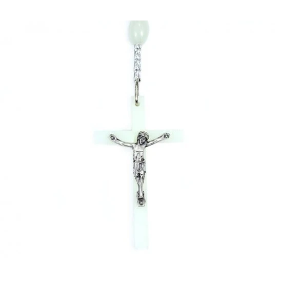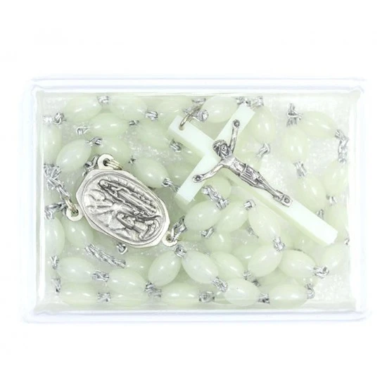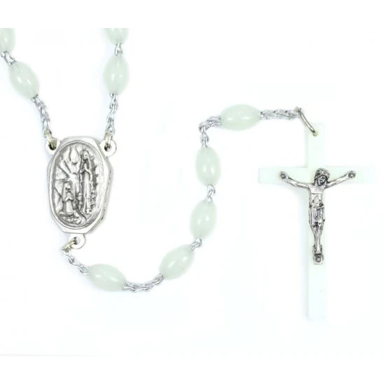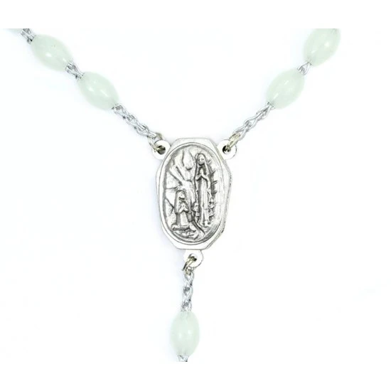 Rosario con grani ovali e crocifisso in plastica fosforescente, la legatura e la crociera con acqua della Madonna di Lourdes sono in metallo argentato.