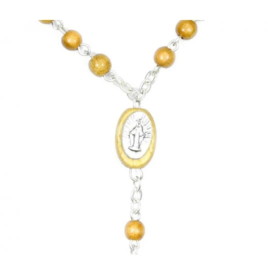 Rosario con grani tondi in legno di ulivo e crociera con placca in metallo della Madonna. La legatura è di metallo argentato, munita di gancio a molla molto utile per poter indossare il rosario al collo.
