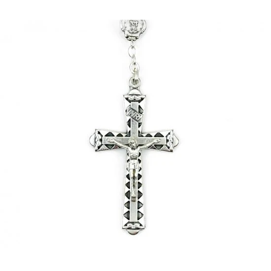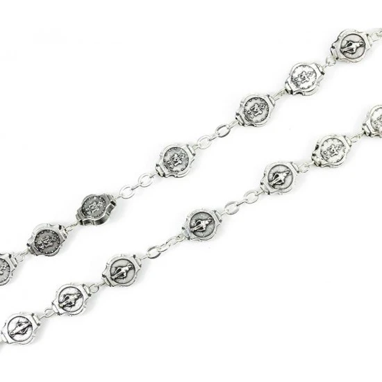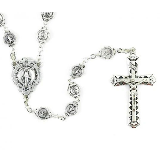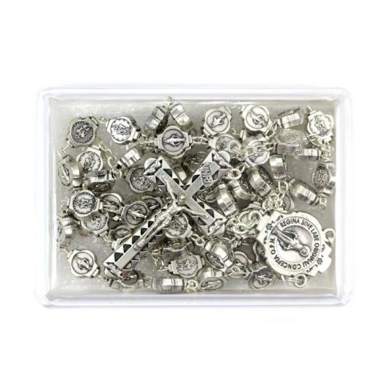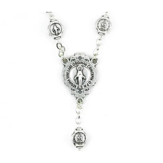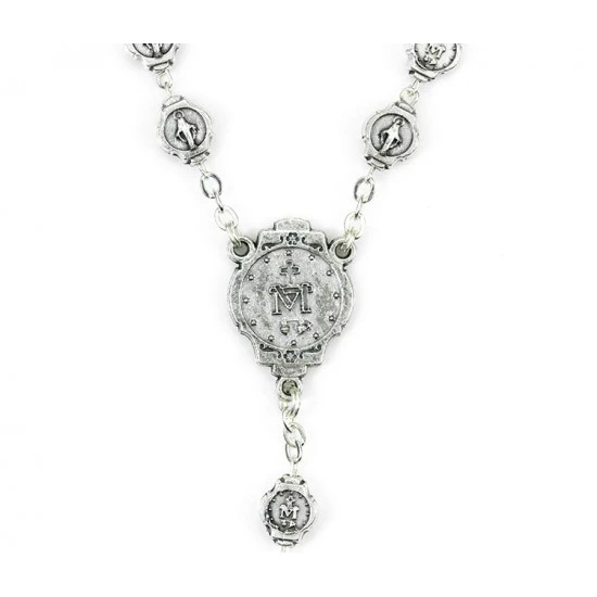 Rosario Madonna Miracolosa in metallo realizzato con le medaglie della Madonna Miracolosa in sostituzione dei grani. La legatura, il crocifisso e la crociera sono in metallo argentato.