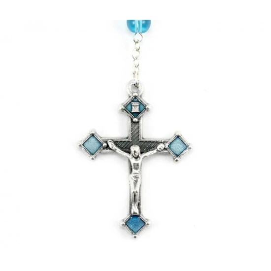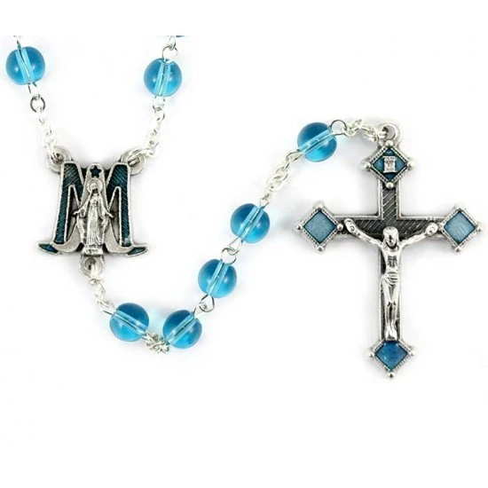 Rosario Madonna Miracolosa realizzato con grani tondi in vetro e legati in metallo, Croce pendente in metallo e smalti. La crociera raffigura la statuetta della Madonna Miracolosa.