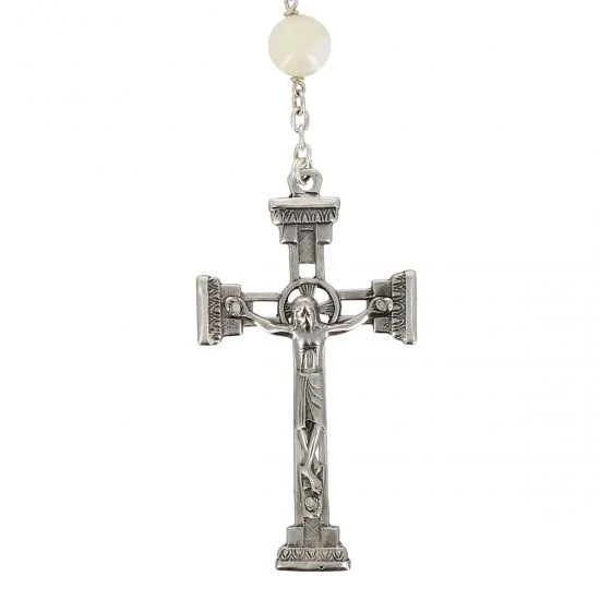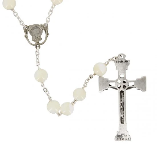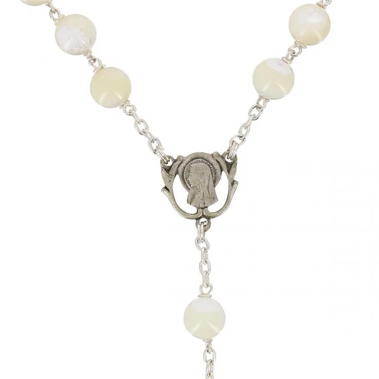 Stupendo Rosario madreperla e argento realizzato con grani tondi in vera madreperla legati con catena in argento 925, la crociera e il Crocifisso pendente sono in argento 925. Fornito in elegante scatola di cartone colore blu. Made in Italy