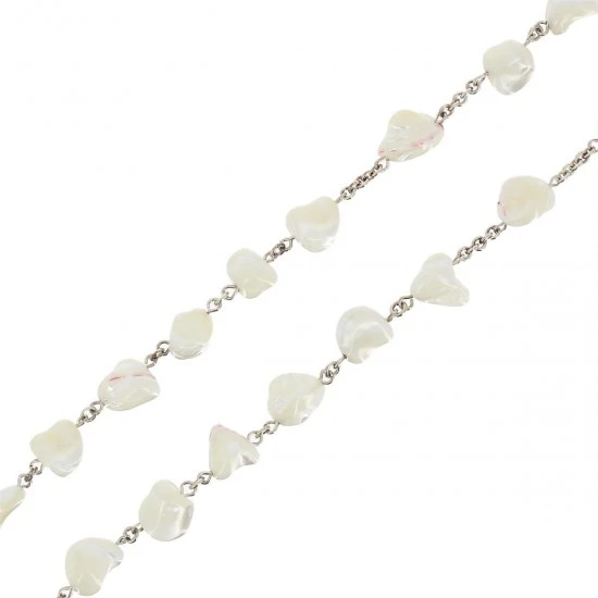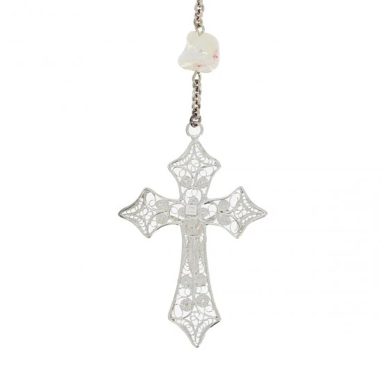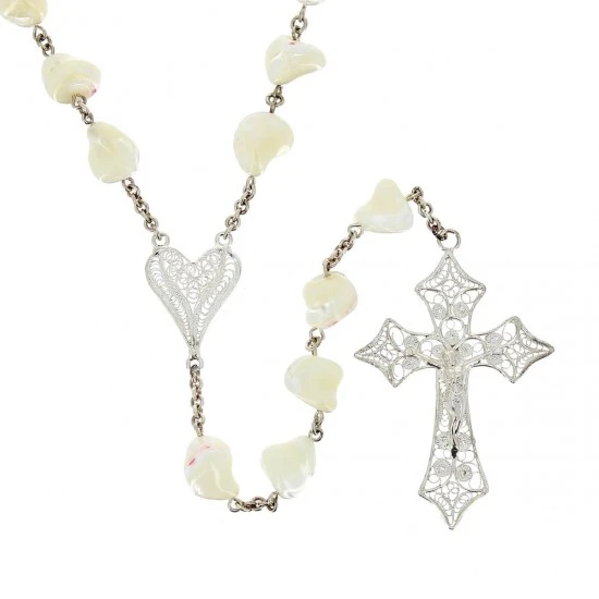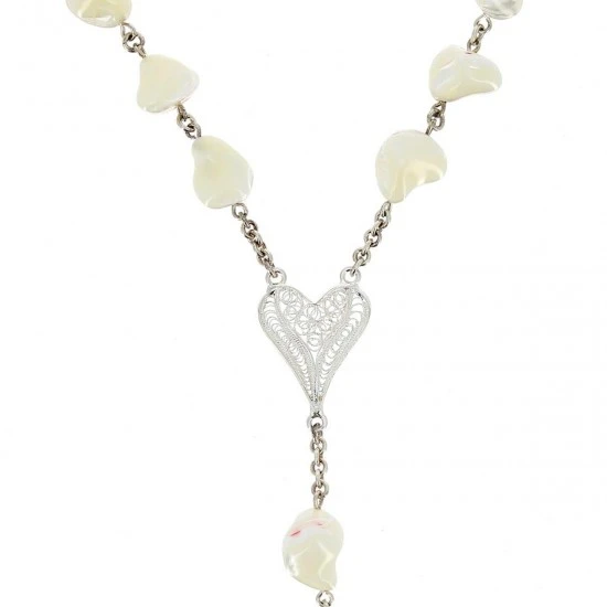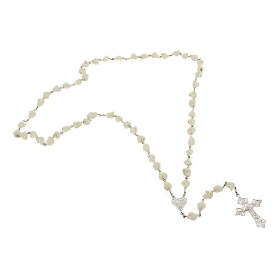 Rosario con grani in madreperla di forma irregolare e legatura in argento 800°°. La crociera a forma di cuore e il crocifisso sono in filigrana d’argento. Adatta anche come rosario capoletto o per essere posto sulle mani di una statua.