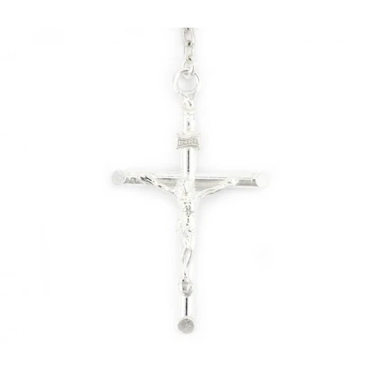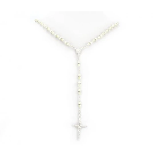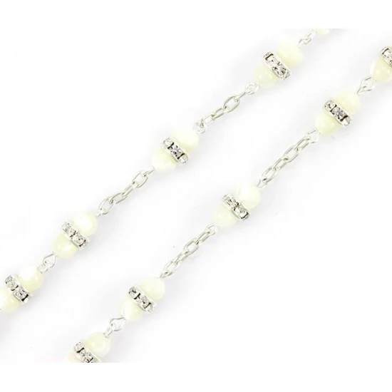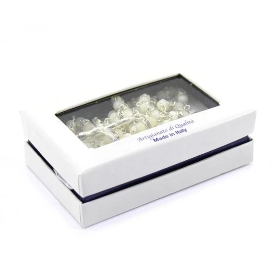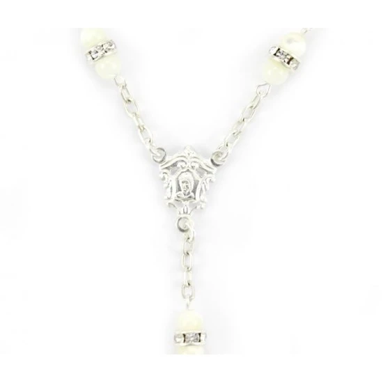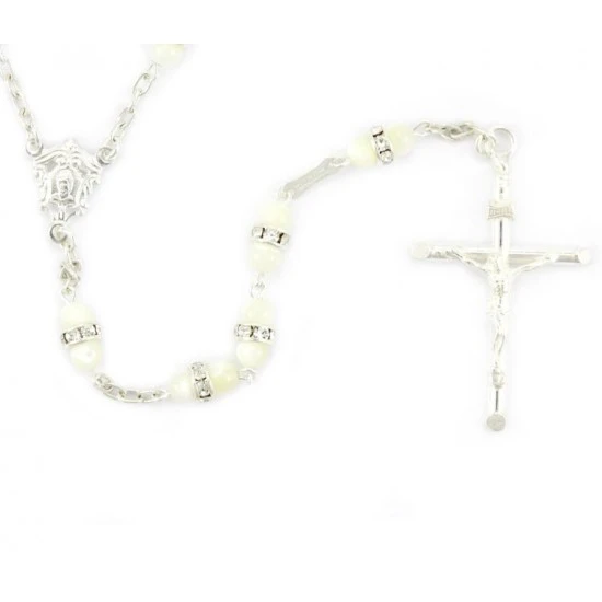 Rosario in vera madreperla intervallata da una rondella di swarovski bianchi. La croce, la crociera e la legatura sono interamente in argento 800°.