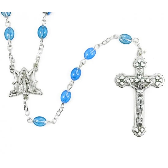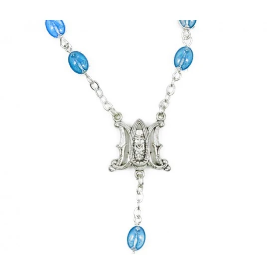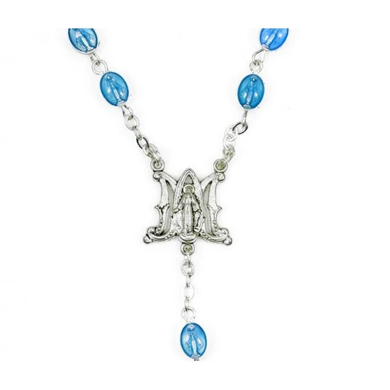 Rosario in metallo realizzato con medagline della Madonna Miracolosa smaltate celesti da un solo lato. La legatura, il crocifisso e la crociera sono in metallo argentato. La crociera è a forma di M con l’immagine della Madonna.