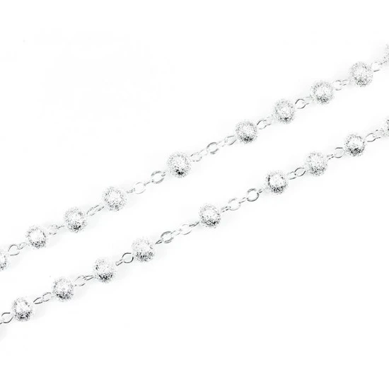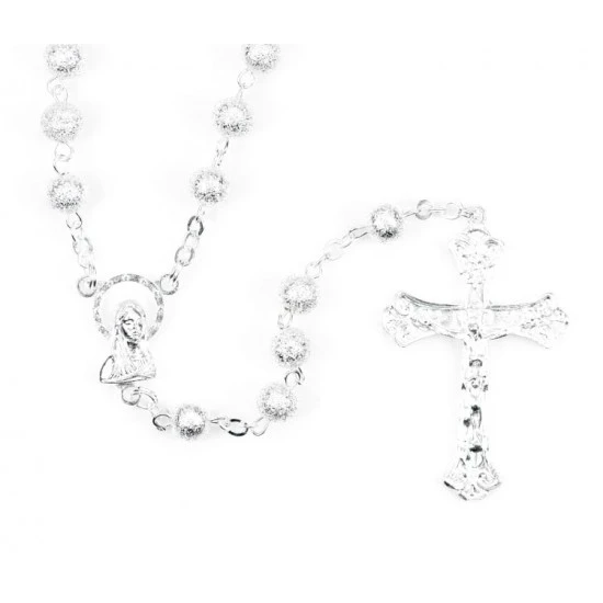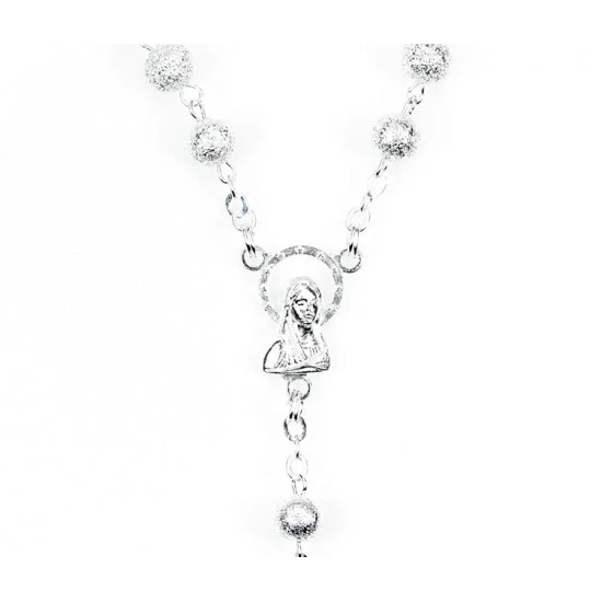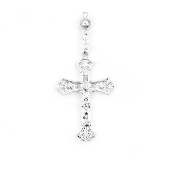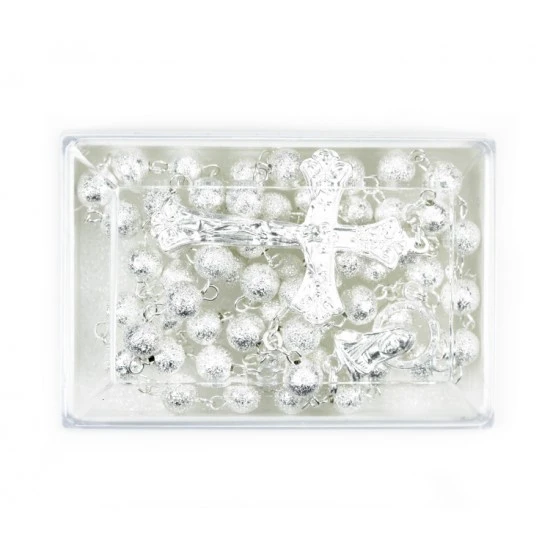 Rosario con grani tondi in metallo sabbiato. La legatura, Il crocifisso e la crociera sono in metallo argentato.