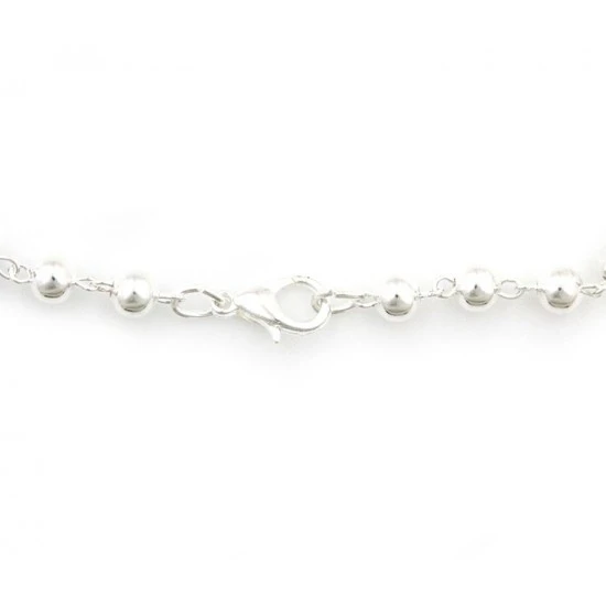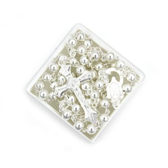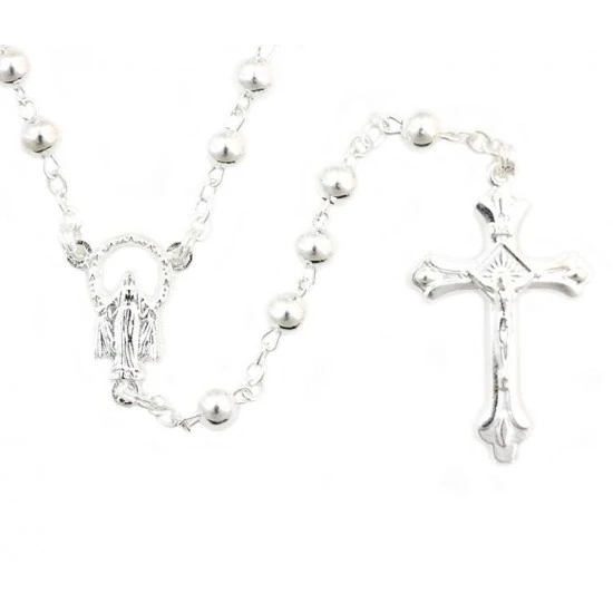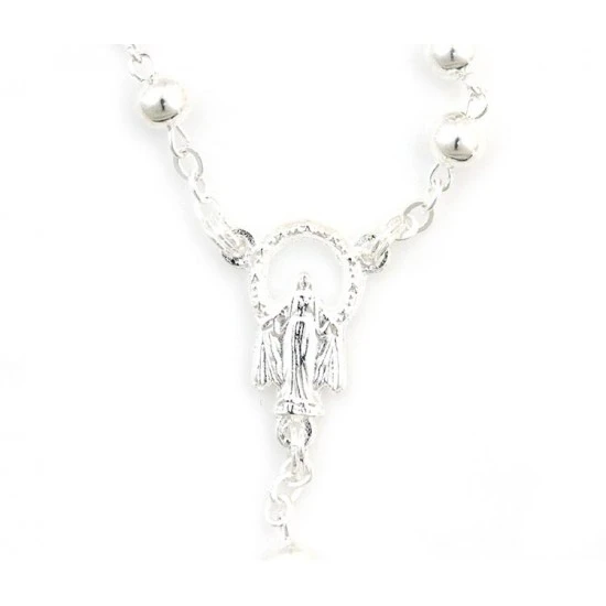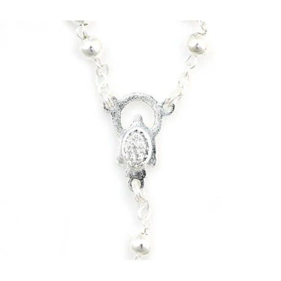 Rosario con grani tondi in metallo, la legatura, il crocifisso e la crociera sono in metallo argentato. ll rosario è munito di gancio a molla per essere indossato comodamente. Completo di astuccio in plastica trasparente 4×5 cm.