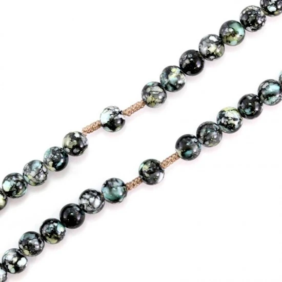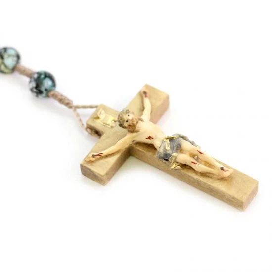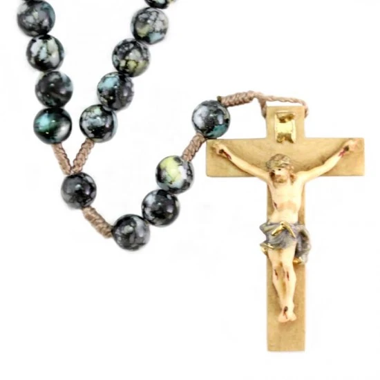 Splendido Rosario realizzato con grani tondi neri imitazioni di pietre dure legati con spago colorato. Il Crocifisso pendente è realizzato interamente in legno colorato, prodotto eseguito con lavorazione artigianale di ottima fattura e ben rifinito nei particolari, fornito in elegante sacchetto nero vellutato con laccetto di chiusura. Made in Italy