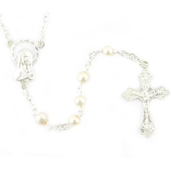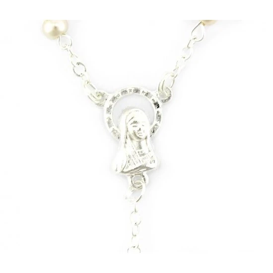 Rosario perla con grani tondi in perla sintetica color avorio. La legatura, il crocifisso e la crociera sono in metallo argentato.