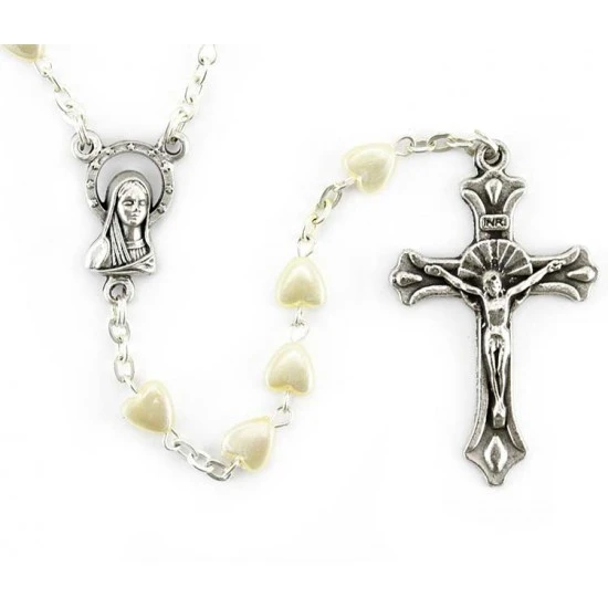 Rosario con grani in perla sintetica a forma di cuore. La legatura, il crocifisso e la crociera sono in metallo argentato.