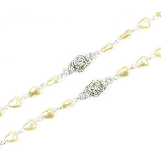 Rosario con grani in perla sintetica tipo perla di fiume con pater rose metallo. La legatura, il crocifisso e la crociera sono in metallo argentato.