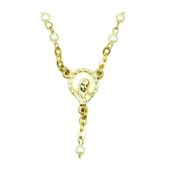 Rosario con grani tondi in perla sintetica. Il crocifisso, la crociera e la legatura sono in metallo dorato.
