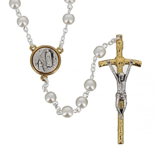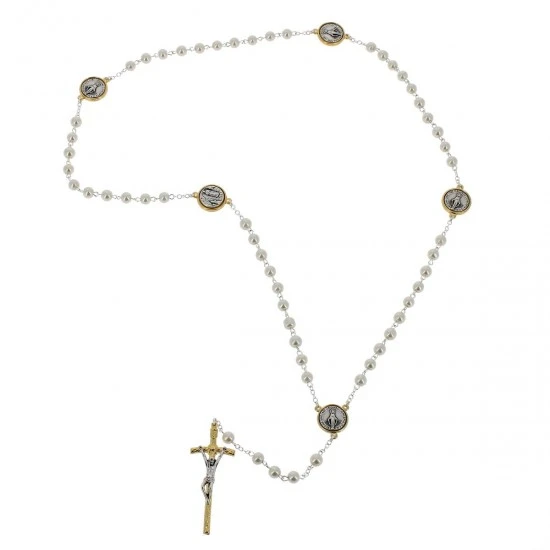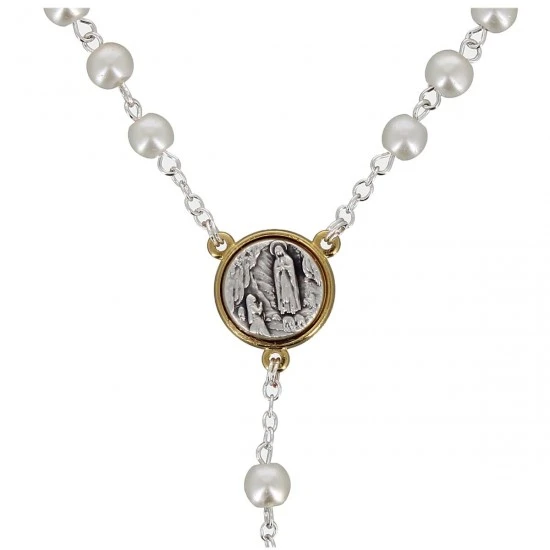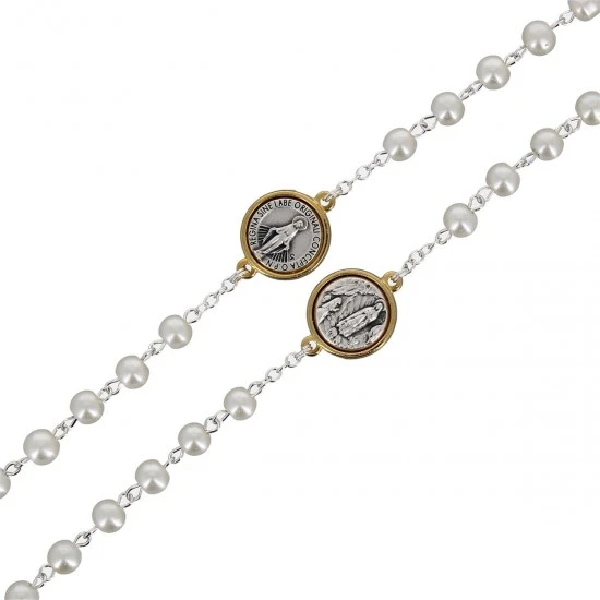 Rosario con medaglie realizzato con grani tondi in vetro bianco imitazione perla, legati con catena in metallo argentato e impreziosito da medaglie in metallo di diametro 1,5 cm raffiguranti la Madonna di Lourdes e la Madonna Miracolosa. Crocifisso pendente in metallo bicolore di ottima fattura, fornito in bustina di plastica trasparente. Made in Italy
