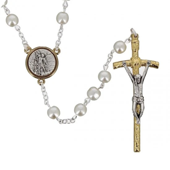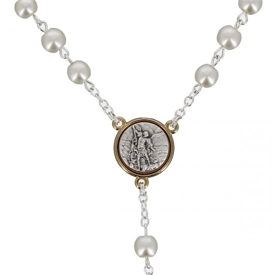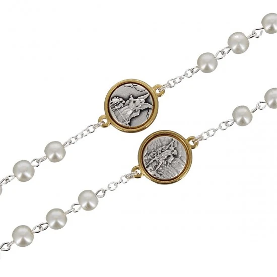 Rosario con medaglie realizzato con grani tondi in vetro bianco imitazione perla, legati con catena in metallo argentato e impreziosito da medaglie in metallo di diametro 1,5 cm raffiguranti San Michele Arcangelo e l’Angelo custode e Crocifisso pendente in metallo bicolore. Fornito in bustina di plastica trasparente. Made in Italy