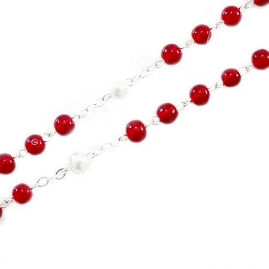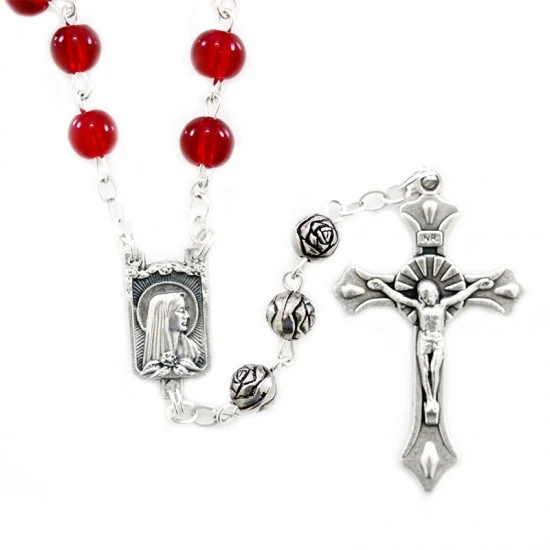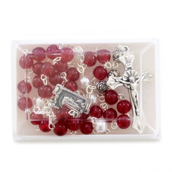 Rosario Preziosissimo Sangue realizzato con grani tondi in vetro rosso legati con catenina in metallo, composto da 6 poste da 5 grani ciascuna. La crociera e la medaglia pendente sono in metallo argentato. Confezionato in scatola di plastica trasparente.