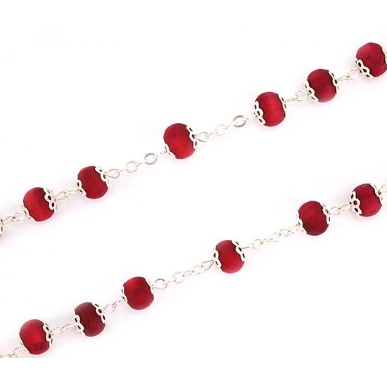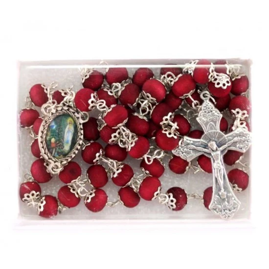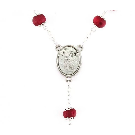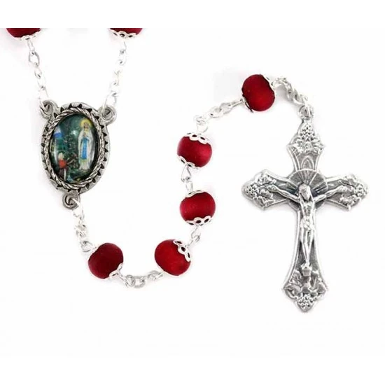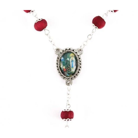 Rosario profumato Madonna di Lourdes realizzato con grani tondi in legno profumato racchiusi ognuno tra 2 coppette in metallo. La legatura, il crocifisso e la crociera sono in metallo argentato.