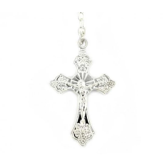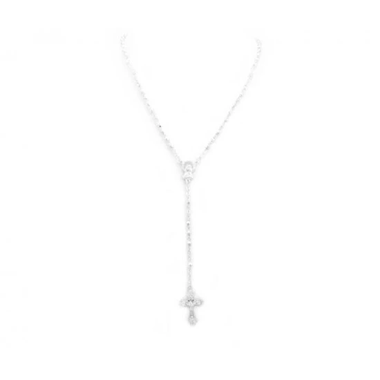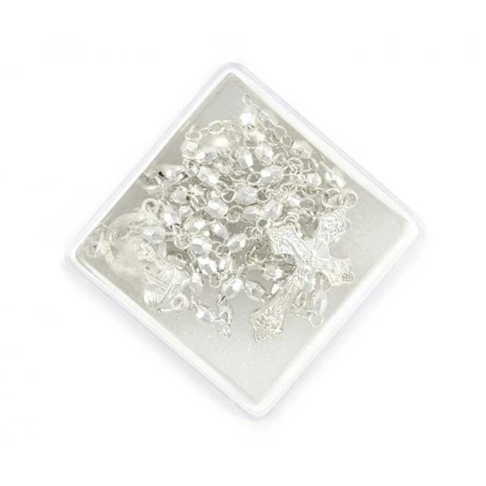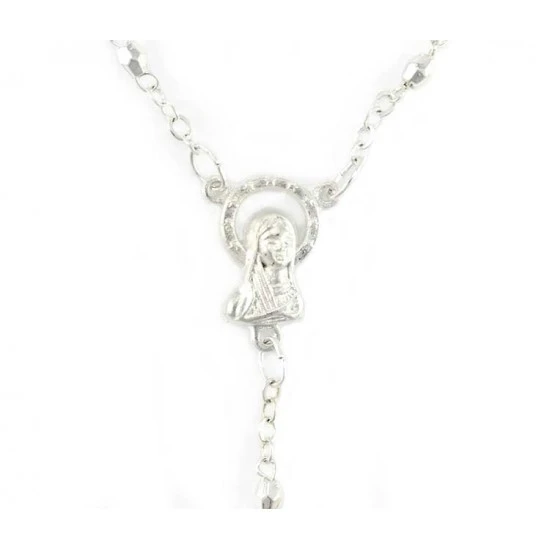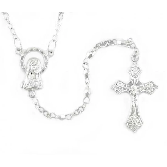 Rosario rondelle realizzato interamente in metallo argentato, con grani a forma di rondelle. Il rosario è munito di gancio a molla per essere indossato comodamente.