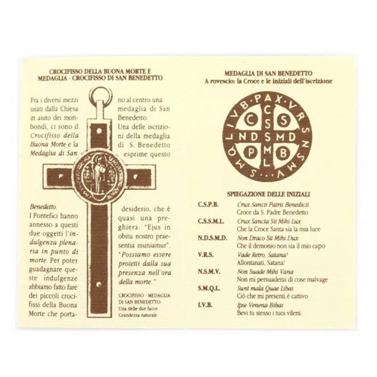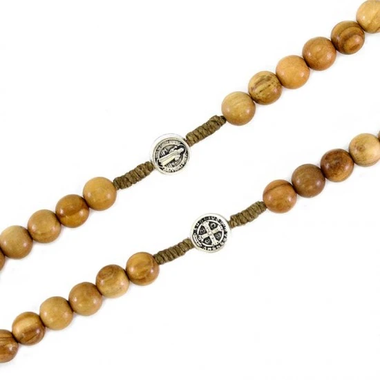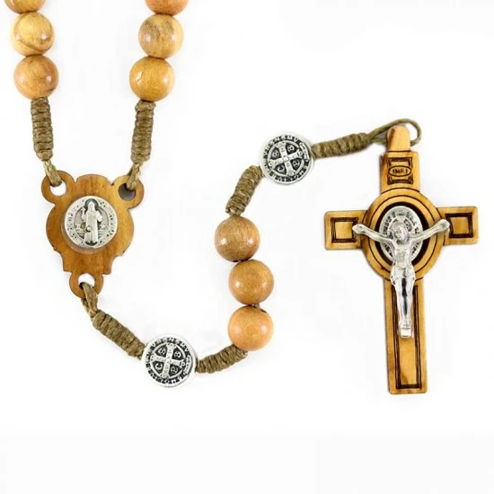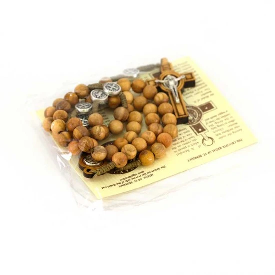 Rosario San Benedetto realizzato con grani tondi in legno di ulivo legati con spago e pater sostituiti da medaglie del Santo in metallo. Il Crocifisso classico devozionale con croce in legno e corpo in metallo, crociera di legno con la medaglia internamente. Confezionato in bustina di plastica trasparente contenente cartoncino con la spiegazione della medaglia. Made in Italy