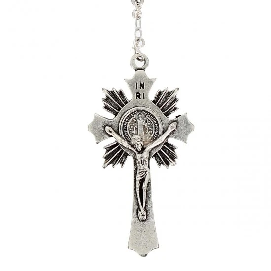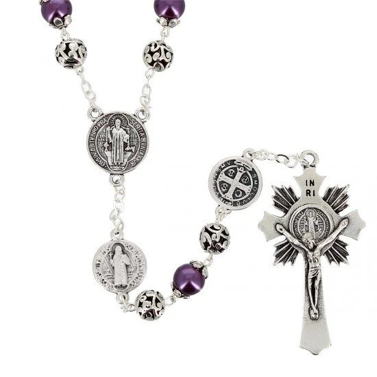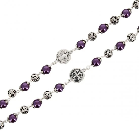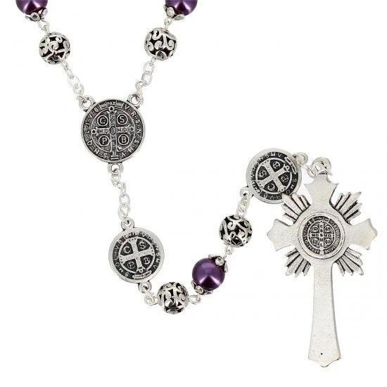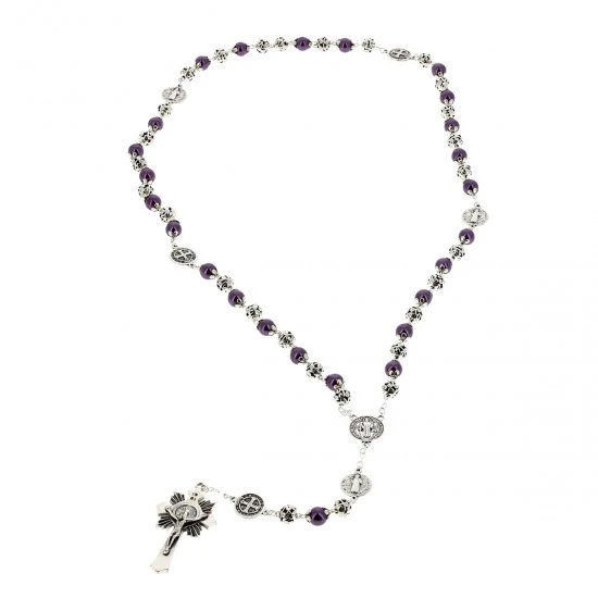 Rosario San Benedetto realizzato con grani tondi accoppigliati simil perla viola, alternati da grani tondi in metallo traforato e legati con catenina in metallo argentato. La crociera e i pater sono sostituiti da medaglie di San Benedetto. Fornito in bustina di plastica trasparente.