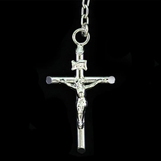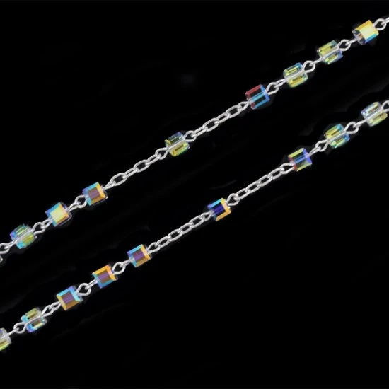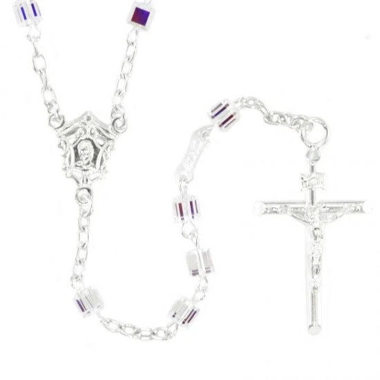 Rosario in argento e swarovski realizzato con grani a forma di piccoli cubi legati con catenina in argento. La crociera raffigura il volto della Madonna e il Crocifisso pendente è modello tronchetto. Made in Italy