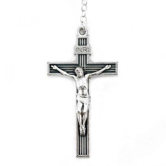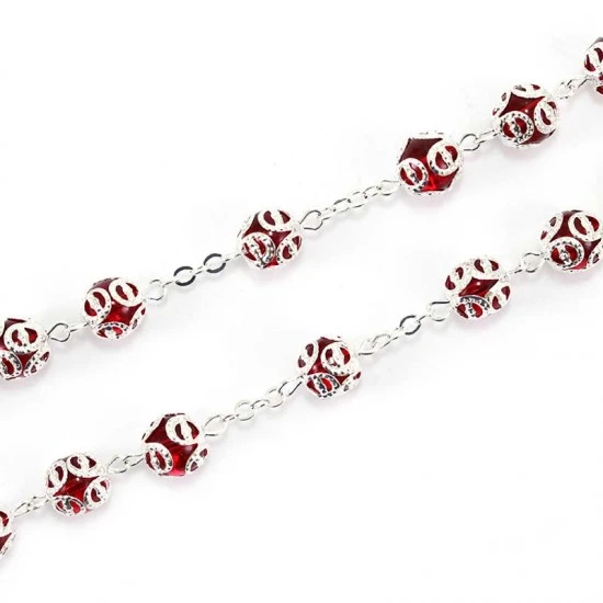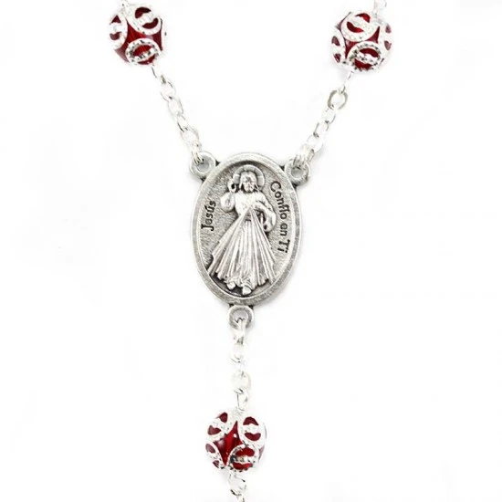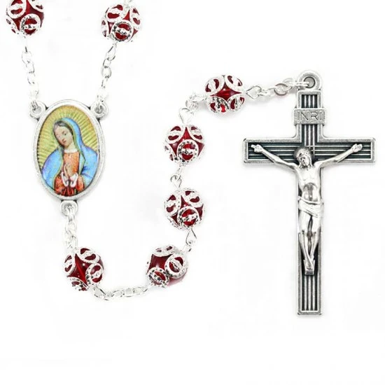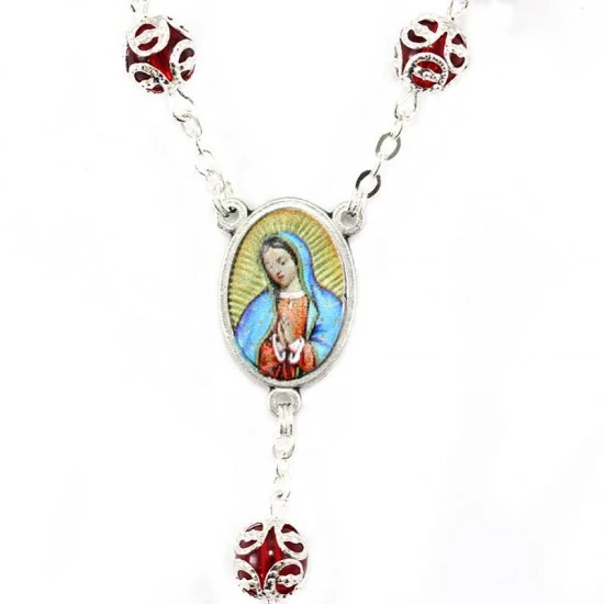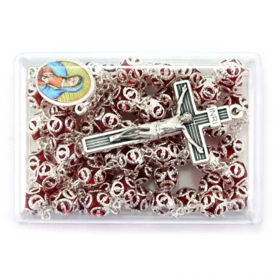 Splendido Rosario realizzato con grani tondi rossi in vetro liscio, avvolti in doppia coppa di metallo traforato e legati con catena in metallo argentato. Crocifisso pendente in metallo di ottima fattura e crociera con raffigurazione della Madonna di Guadalupe. Confezione contenente cartoncino con immagine colorata. Made in Italy