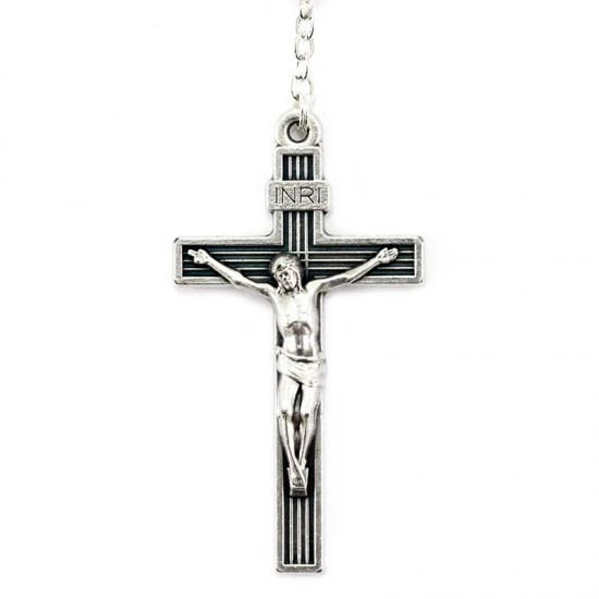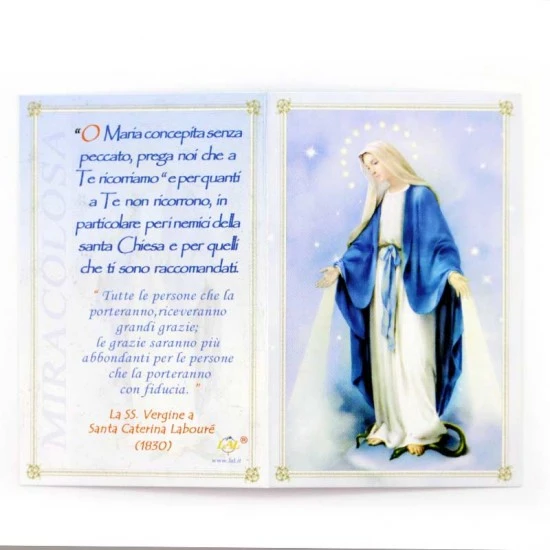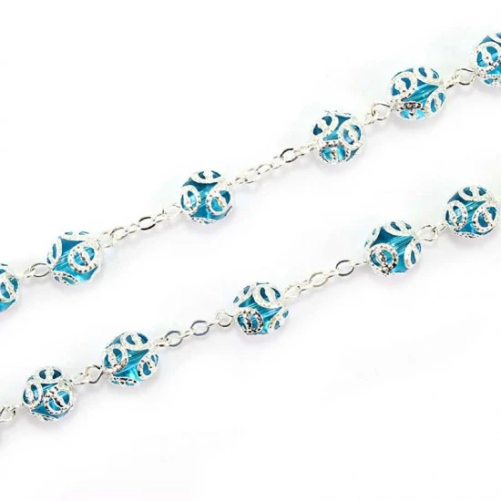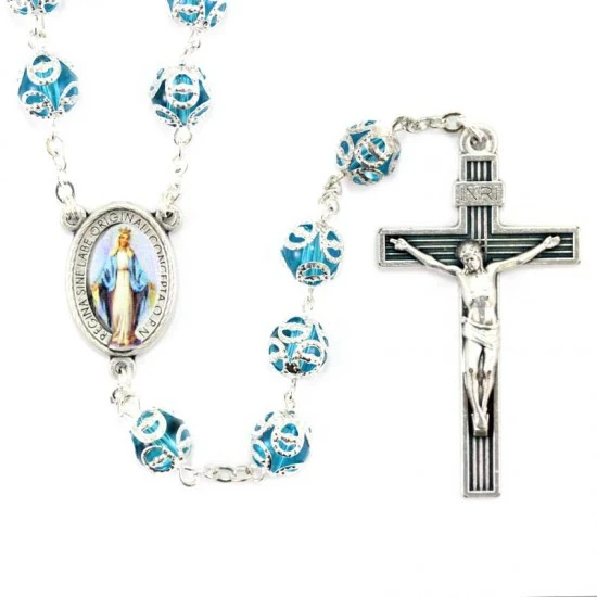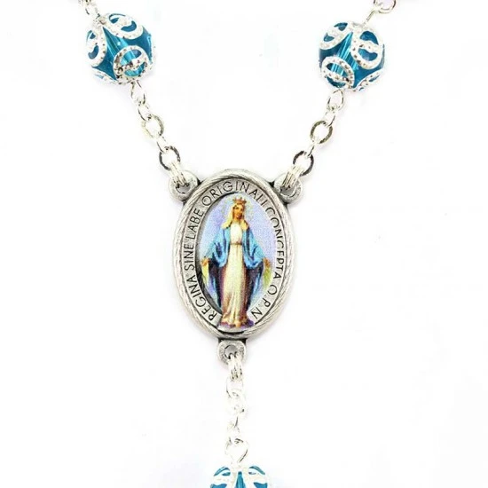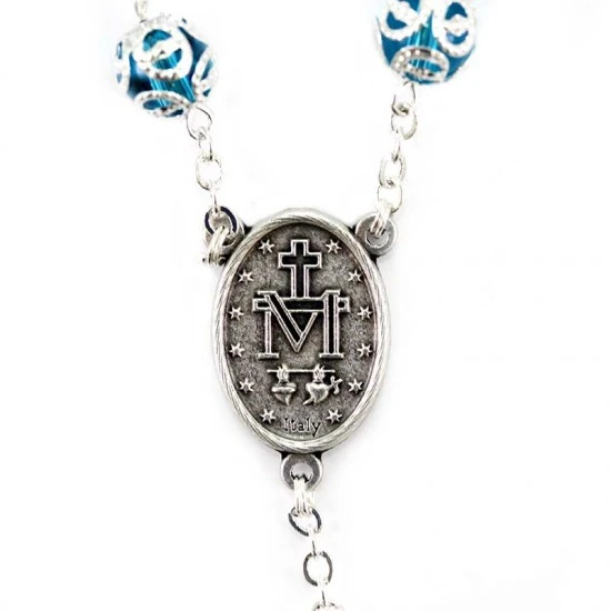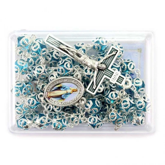 Splendido Rosario realizzato con grani tondi celesti in vetro liscio, avvolti in doppia coppa di metallo traforato e legati con catena in metallo argentato. Crocifisso pendente in metallo di ottima fattura e crociera con raffigurazione della Madonna Miracolosa. Confezione contenente cartoncino con immagine colorata. Made in Italy