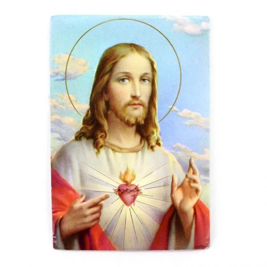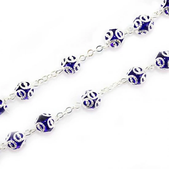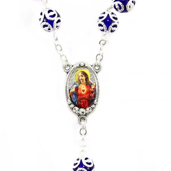 Splendido Rosario realizzato con grani tondi blu in vetro liscio, avvolti in doppia coppa di metallo traforato e legati con catena in metallo argentato. Crocifisso pendente in metallo di ottima fattura e crociera con raffigurazione del Sacro Cuore di Gesù. Confezione contenente cartoncino con immagine colorata. Made in Italy