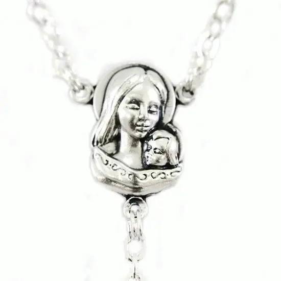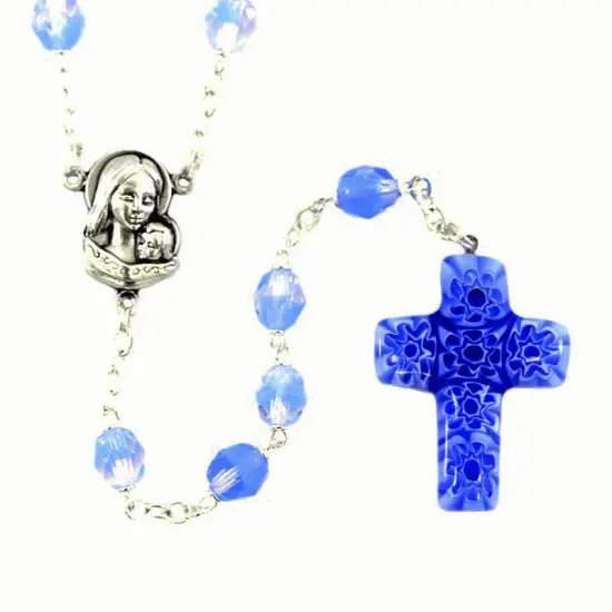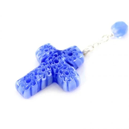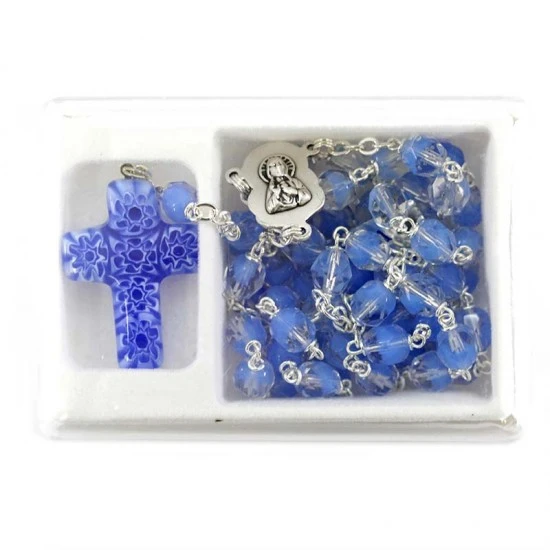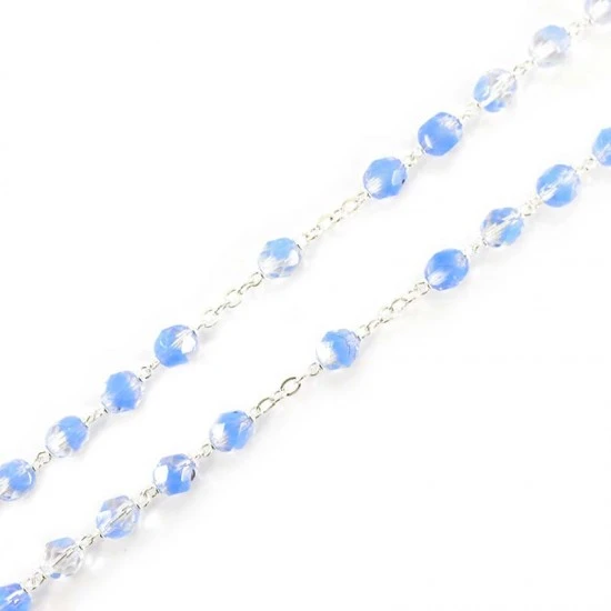 Rosario realizzato con grani in vetro sfaccettato colore celeste legati con catena in metallo argentato e impreziosito dalla crociera in metallo e croce pendente di murrina. Fornito completo di scatola in plastica trasparente. Made in Italy