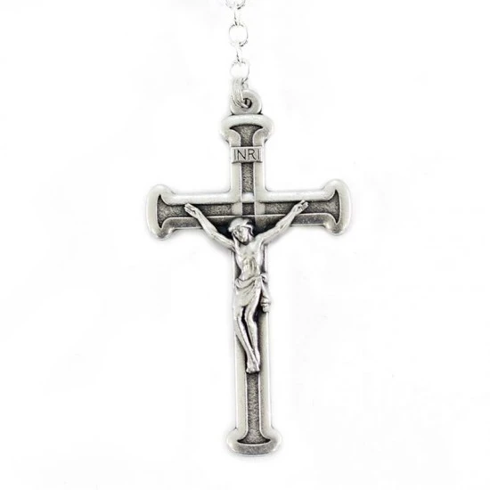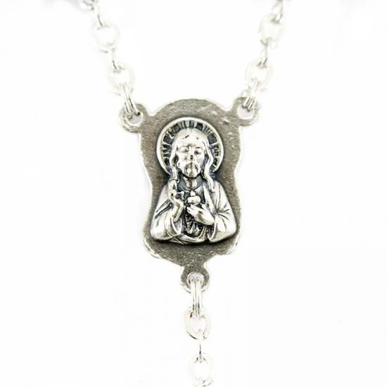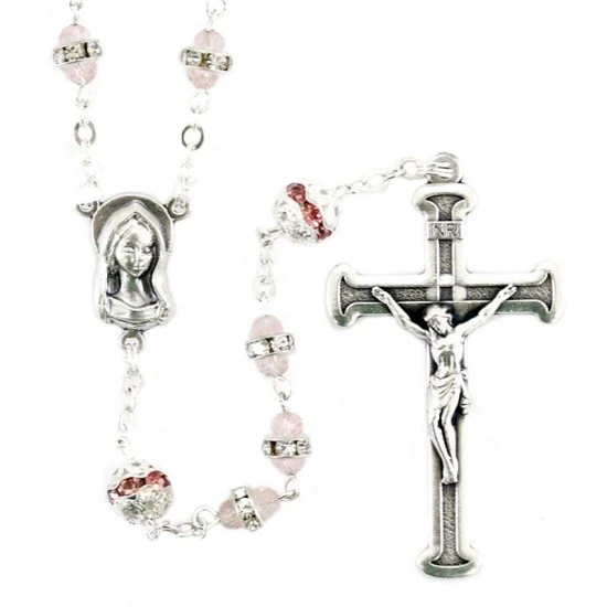 Rosario realizzato con grani in vetro di colore rosa avvolti da una fascia ricoperta di strass bianchi e legati con catena in metallo argentato. Il Crocifisso pendente e la crociera sono in metallo argentato. Fornito in elegante scatola di cartone. Made in Italy