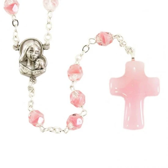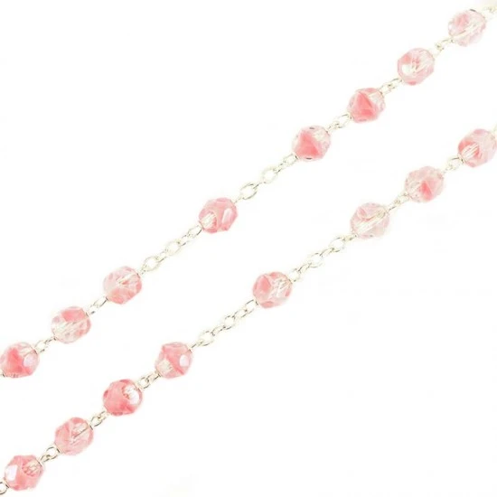 Rosario realizzato con grani in vetro sfaccettato colore rosa legati con catena in metallo argentato e impreziosito dalla crociera in metallo e croce pendente di murrina. Fornito completo di scatola in plastica trasparente. Made in Italy