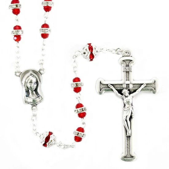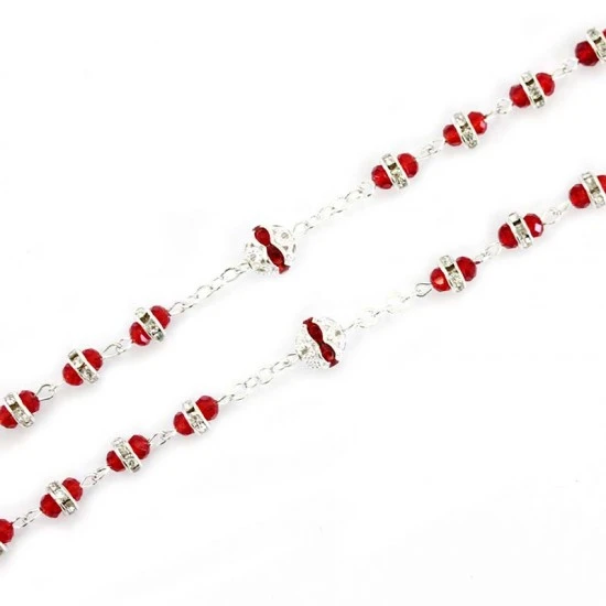 Rosario realizzato con grani in vetro di colore rosso avvolti da una fascia ricoperta di strass bianchi e legati con catena in metallo argentato. Il Crocifisso pendente e la crociera sono in metallo argentato. Fornito in elegante scatola di cartone. Made in Italy