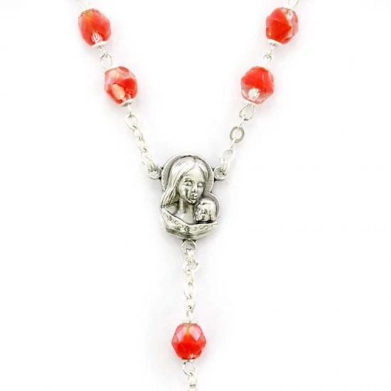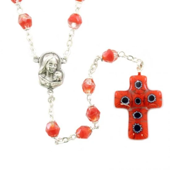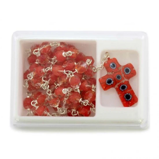 Rosario realizzato con grani in vetro sfaccettato colore rosso legati con catena in metallo argentato e impreziosito dalla crociera in metallo e croce pendente di murrina. Fornito completo di scatola in plastica trasparente. Made in Italy