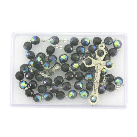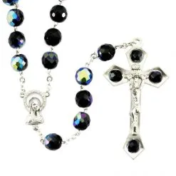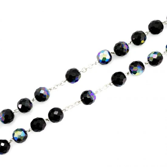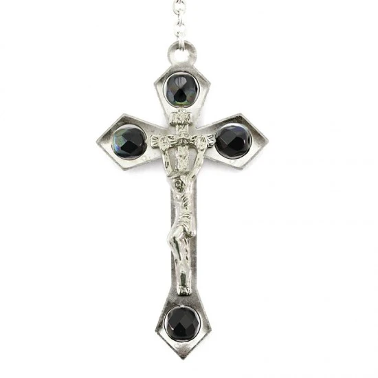 Rosario con grani in vetro sfaccettato. La legatura, il crocifisso e la crociera sono in metallo argentato.