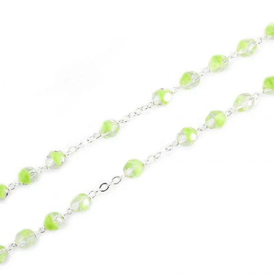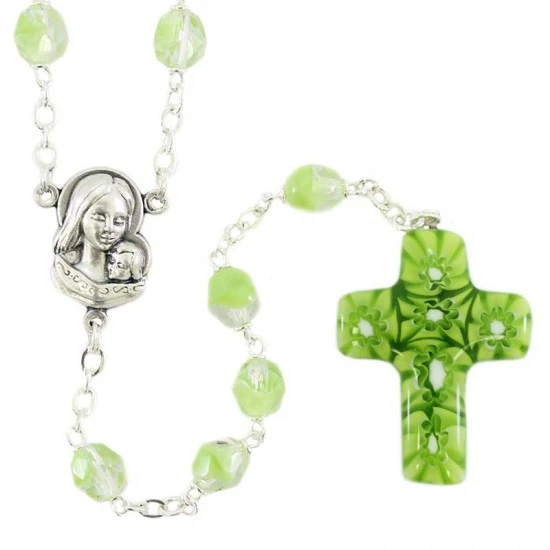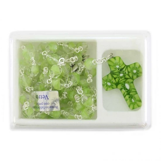 Rosario realizzato con grani in vetro sfaccettato colore verde legati con catena in metallo argentato e impreziosito dalla crociera in metallo e croce pendente di murrina. Fornito completo di scatola in plastica trasparente. Made in Italy