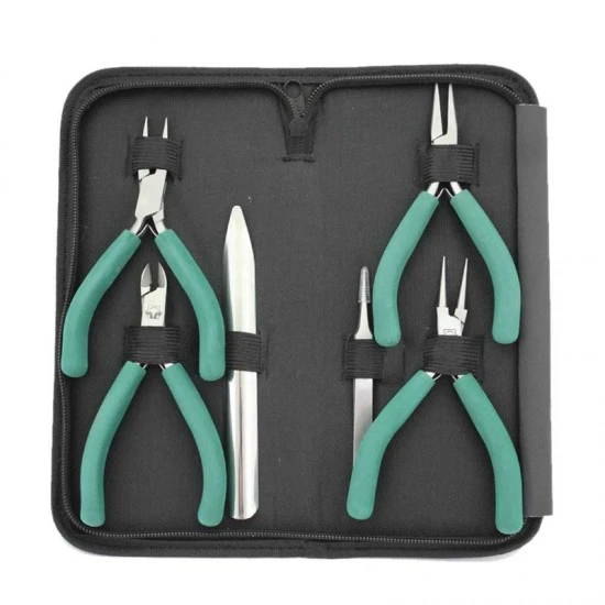 Set 4 pinze assortite con punte diverse adatte per montaggi di rosari, bracciali, decine, eccetera eccetera. Prodotto fornito completo di astuccio militare con chiusura a zip.