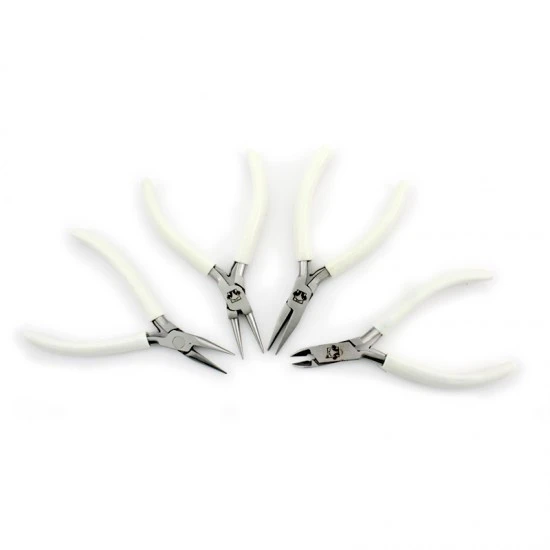 Set 4 pinze assortite con punte diverse adatte per montaggi di rosari, bracciali, decine, eccetera eccetera. Prodotto fornito completo di astuccio.