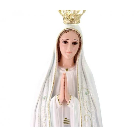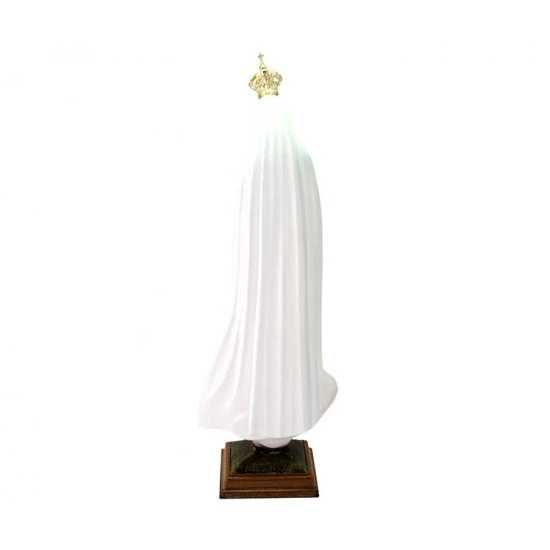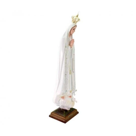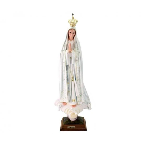Statua Madonna di Fatima realizzata in plastica colorata con glitter e occhi di vetro, arricchita di strass e Impreziosita dalla corona sul capo e tre colombine poste ai piedi della Madonna. Confezionata in scatola di cartone. Made in Portugal