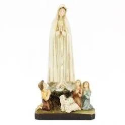 Statua Madonna di Fatima con pastorelli, realizzata interamente in resina piena colorata con colori molto tenui. Prodotto di ottima fattura e ben rifinito nei particolari confezionato in scatola di cartone con imballaggio sicuro per il trasporto. Made in Italy