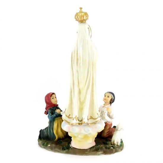 Gruppo Apparizione di Fatima raffigurato con i tre pastorelli raccolti in preghiera davanti alla Madonna, realizzato interamente in resina colorata. Prodotto di ottima fattura e ben rifinito nei particolari, fornito confezionato in scatola di cartone.