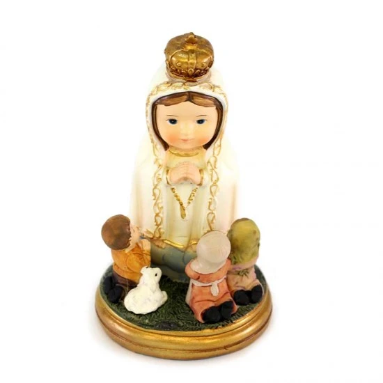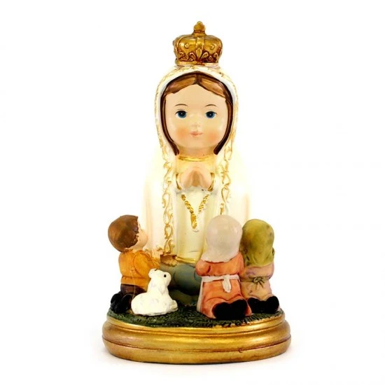 Statua Madonna di Fatima con pastorelli baby realizzata interamente in resina colorata. Simpatica statua espressamente disegnata con un’iconografia adatta ai bambini. Confezionata in scatola di cartone.
