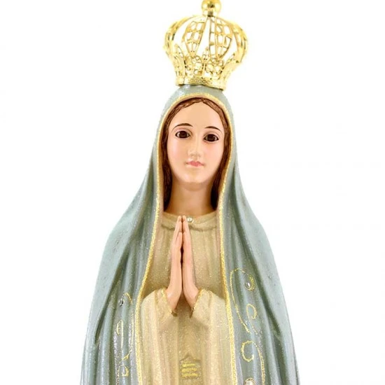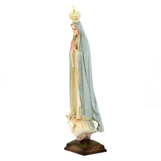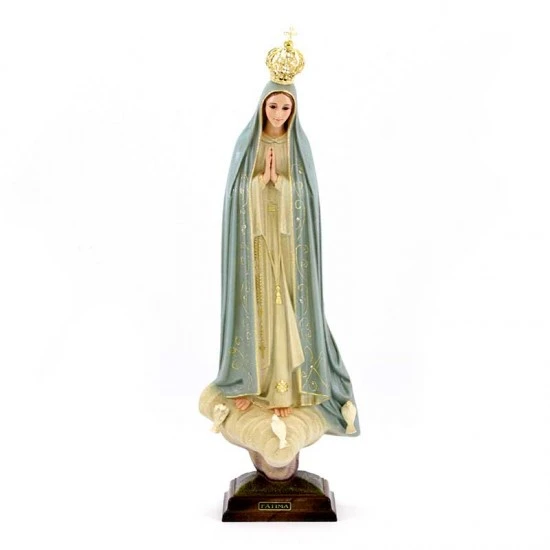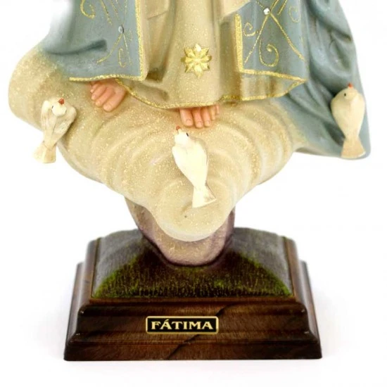 Statua Madonna di Fatima realizzata in plastica dipinta a mano con la massima cura per i dettagli, arricchita dagli occhi di vetro e strass trasparenti posti sul manto. La statua è munita di corona sul capo in plastica dorata ed è fornita confezionata in scatola di cartone. Prodotto realizzato a Fatima in Portogallo di ottima fattura e ben rifinito nei particolari. Made in Portugal
