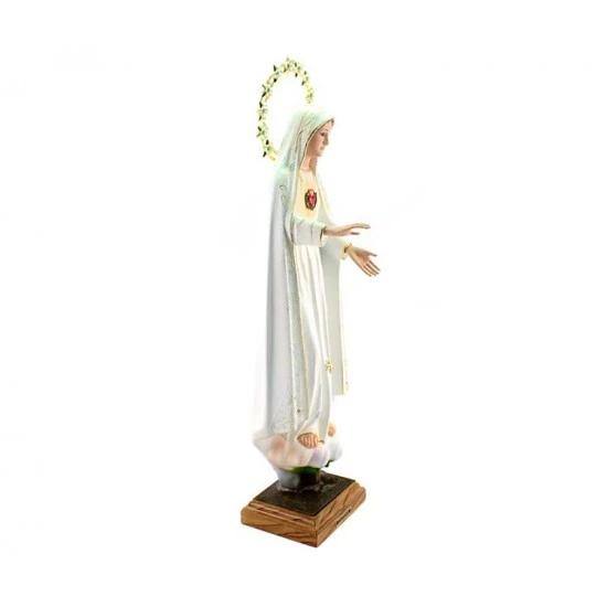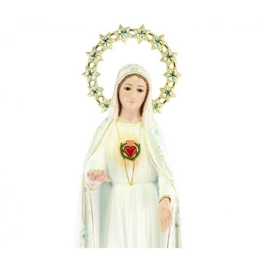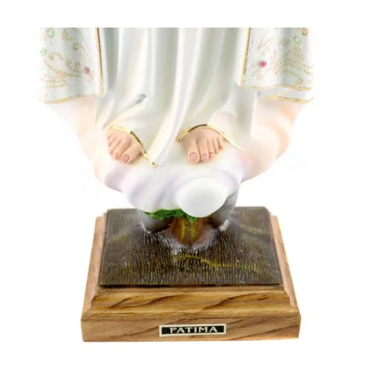 Statua Madonna di Fatima realizzata in plastica colorata con glitter e occhi di vetro e arricchita di strass. Confezionata in scatola di cartone. Made in Portugal