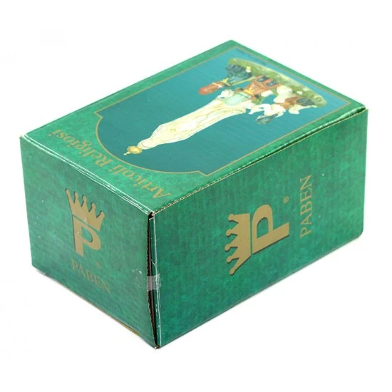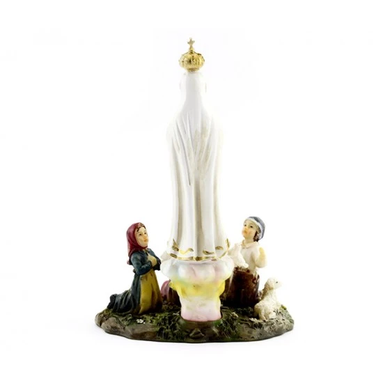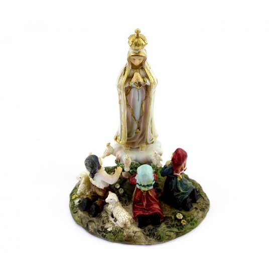 Statua Madonna di Fatima con pastorelli realizzata in resina colorata. Fornita con scatola di cartone litografata