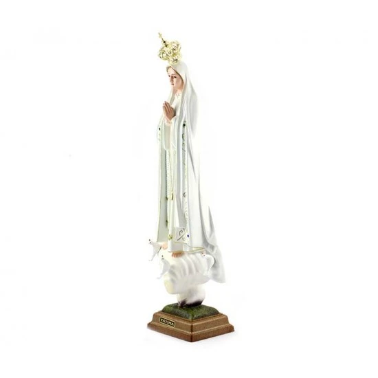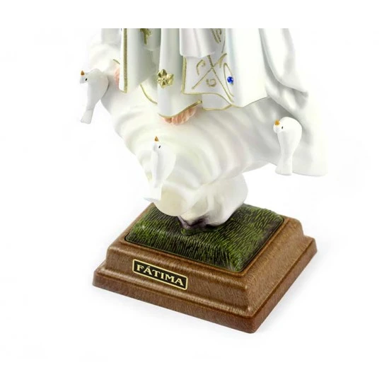 Statua Madonna di Fatima realizzata in plastica colorata con occhi di vetro e Impreziosita dalla corona sul capo e tre colombine poste ai piedi della Madonna. Confezionata in scatola di cartone. Made in Portugal